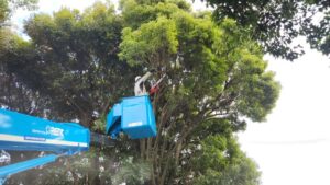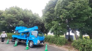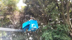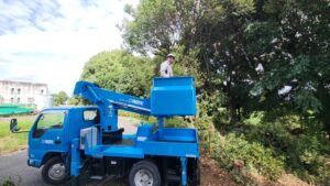 今回は伐倒する場所が少ないので、高所作業車で作業しました。